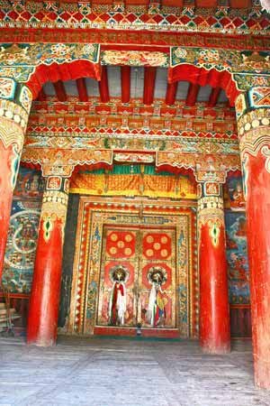 Дома крашены в 3 цвета: «рога» - белые, затем по периметру всего дома и башен идет полоса глубокого красного цвета, за ней – черная полоса, потом – охристая и снова белая стена. Деревянные части дома, балки, перекрытия - того же природного красного цвета. Внутри все покрыто росписью: растительные орнаменты, языческие сюжеты и картины из жизни Будды.