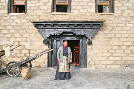 Раннее утро третьего дня. Нас подняли до рассвета, чтобы успеть на встречу с жемчужиной Тибета - горой четырех сестер. Вчера не удалось рассмотреть ее из-за дождя, а сегодня вершины горы-красавицы укутаны снегом. Налюбовавшись розовыми от солнца «сестрами», начинаем спускаться по ущельям вниз. Справа - обрыв и река, слева - сплошная скальная стена. И всюду каким-то непостижимым образом висят дома из камня. Три часа катимся вниз по единственной дороге. Она же - и улица, и связь с миром.