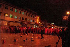 Войска народной вооруженной полиции заставили монахов прекратить побелку стен Ганден Подранга в утро торжественной церемонии вручения Золотой медали, после чего, по одному из свидетельств, монахи мирно разошлись и продолжили свои утренние молитвы. Когда же монахи вновь вернулись к побелке, полицейские силой заставили их остановиться, при этом один из монахов получил удар в голову. По сообщению гонконгской газеты «Минг Пао», за этим последовали «жестокие столкновения» между полицией и сотнями монахов, однако проверить, действительно ли монахи прибегли к насилию, не представляется возможным.