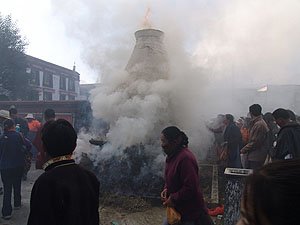 Тибетцы возжигают благовония в честь вручения Далай-ламе Золотой медали Конгресса США на Баркхоре (кольцевой улице вокруг Поталы)