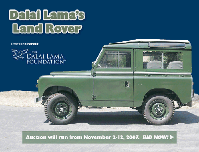 Сайт eBay предлагает своим посетителям уникальную возможность приобрести на аукционе автомобиль, принадлежавший ранее Далай-ламе. Джип Land Rover, на котором Его Святейшество ездил с 1966 по 1975 год, выставила на продажу Шэрон Стоун. По словам устроителей аукциона, автомобиль находится в прекрасном состоянии, несмотря на свой почтенный возраст. В 1975 Далай-лама отдал его своему брату, который, в свою очередь, передал его в дар Фонду Далай-ламы в Калифорнии. «Те, кому посчастливилось лично встречаться с Его Святейшеством, знают, что он распространяет вокруг себя особый, позитивный настрой», - говорит Шэрон Стоун. «Могу себе представить, что должен чувствовать человек, который станет ездить в машине, принадлежавшей Далай-ламе. Возможно, он будет постоянно смеяться!».