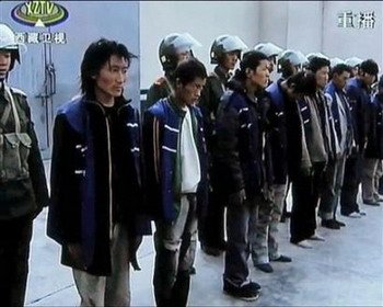 Полицейские стоят за спинами арестованных тибетцев. Место неизвестно. 20 марта 2008