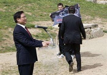 Во время выступления главы организационного комитета Олимпийских игр Лю Ци в объективы камер попали двое активистов, которые пытались развернуть транспарант с надписью «Бойкот стране, которая попирает права человека».