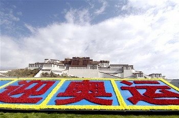 Баннер из цветов, выложенный в среду в Лхасе в честь начала 100-дневного отсчета до Олимпиады в Пекине