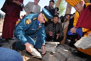 Напомним, что первые красноватые плиты на дороге к храму Устуу-Хурээ накануне открытия 21 мая выложили волонтеры из Сут-Холя. Рядом голубоватый пятачок, заложенный энтузиастами из Ак-Довурака. Город асбестовиков делегировал на стройку студенческий стройотряд. Каменная груда, прибывшая из Тоджи, преодолела часть пути на лодке. Тоджинцы еще только мечтают о мосте через Енисей. Тандинцы бросили у себя в районе клич и на средства откликнувшихся – более 50 тысяч рублей – наняли Камаз, чтобы доставить в Дзун-Хем темный тандинский камень. Монгун-тайгинцы собрали для Устуу-Хурээ камни со своих родовых мест.