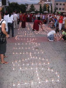 С кусочками торта в руках буддисты направились к Пагоде Семи Дней, где состоялась акция подношения света. Сотни лампадок зажгли жители Элисты как подарок Его Святейшеству. Примечательно то, что подобная акция происходит уже не первый раз в калмыцкой столице, причем это всегда очень красивое действо, навевающее настроение праздника. Эажигание свечей и лампадок – часть традиционной культуры и традиций калмыков. Это подношение божествам и символ светлого будущего, открытого пути (как говорят калмыки - «белой дороги»). В современном мире подношение света – это еще и способ выразить свои самые глубочайшие пожелания и мечты. На этот раз на центральной площади появились «огненные» слова: «С днем рождения, Далай-лама. Wеlcome to Kalmykia». Спонсорами акции выступили краснодарские буддисты и «Золотая обитель Будды Шакьямуни».