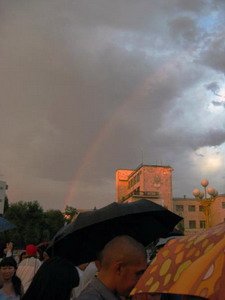 В завершение дня природа также поделилась с людьми своей радостью и восхищением праздником: на небе раскинулись две радуги в тот момент, когда люди только начали чертить мелом на асфальте поздравительные слова Далай-ламе. Небо превратилось в настоящую мозаику из темных туч, белых облаков и голубых просветов. И падал теплый блестящий неназойливый дождь, похожий на слезы радости…
