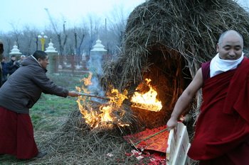В завершение ритуала монахи бросили торму внутрь соломенного шалаша, который незамедлительно был предан огню, после чего участники церемонии немедленно развернулись и ушли, не оборачиваясь.
