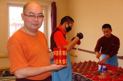 - Уже больше месяца мы с ламами из Непала Бальджир Цереном, Санджи Пюрвей оформляем металлические формы барабанов, красим, монтируем в них подножки и т.д., а недавно к нам приехал лама Дава Церен, который является учеником наших духовных учителей Кенчен Палден Шераб Ринпоче, и тоже помогает нам в этом процессе. Как я уже ранее говорил, эту идею вынашивал давно. В Непале есть знаменитая Ступа с глазами Джа-рунхашор, вокруг которой установлены больше ста молитвенных барабанов. Кстати, наша Ступа и непальская кармически связаны между собой. Мне удалось побывать здесь шесть раз, где я не упускал возможности обойти ее и прокрутить все эти барабанчики, вознося молитвы, чтобы и на икибурульской земле мы бы могли иметь такую возможность прикоснуться к святыням. Вот и сбылось мое огромное желание - Ступа Просветления, одна из самых высоких в Европе, у нас уже есть, а сейчас осталось довести работу по установке барабанов-кюрде. Надеемся, что к празднику Цаган Сар все успеем сделать.