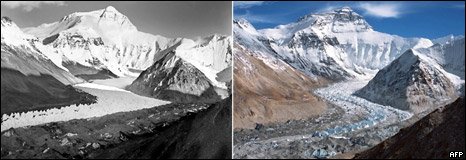 На изображениях, полученных в 1921 году, видно, что ледник Ронгбук спускается с Эвереста извилистой полосой в виде английской буквы S. На современном снимке видно, что количество льда значительно сократилось.