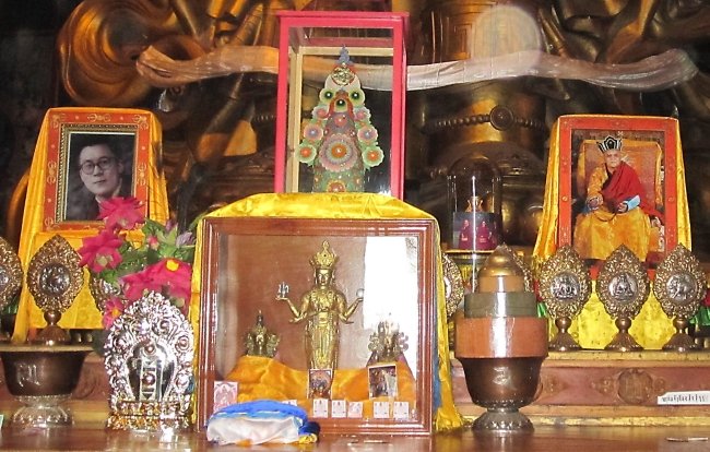 Портреты Далай-ламы XIV и Богдо-гэгэна IX перед главной святыней монастыря Гандантэгченлин – статуей Мэгжид Жанрайсэг.