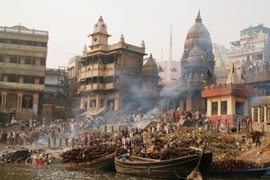 Чуть дальше по набережной стоят древние храмы, у подножия которых проводят обряды кремации. Кучами заготовлены дрова, из-за которых почти не видны участники действа. Запах горящих человеческих тел трудно вынести спокойно. Труп не успевает превратиться в пепел, а его уже спускают в Ганг. Тут же загорается пламя над следующим покойником, этот процесс кажется бесконечным. По традиции, провожая в последний путь (считается, что если человек умрет у Ганга, его душа больше не будет перевоплощаться), к телу прилаживают драгоценные вещи. Некоторые молодые индийцы, по рассказам бывалых туристов, в поисках наживы ныряют, чтобы под водой собирать чужое добро.