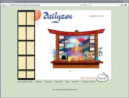 Сайт полностью соответствует своему названию. В принципе, все формы кибер буддизма созданы для напоминания о ежедневной практике и для ее облегчения. Но ядро этого сайта составляет онлайн алтарь, он находится в виртуальной комнате, в которой можно медитировать в любое время и в любом месте. Главное условие – это наличие интернета. На выбор дается три варианта длительности виртуальной медитации: 15, 20 и 30 минут. После чего она начинается и в зал можно войти.