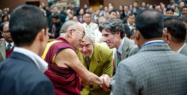 Далай-лама приветствует Алана Уоллеса и Ричарда Дэвидсона, участников конференции "Наука и духовность"
