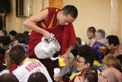 На протяжении нескольких последних лет организаторы проводят особые Учения для буддистов России, куда приезжают паломники из Калмыкии, Тувы, Бурятии, а также немало монголов. Есть здесь и несколько паломников из Казахстана. Разумеется, Казахстан ― это не буддийская страна… Есть также люди из Латвии. Вы из России? А вы? Из Казахстана. Вот уже несколько лет мы проводим такие учения для россиян.