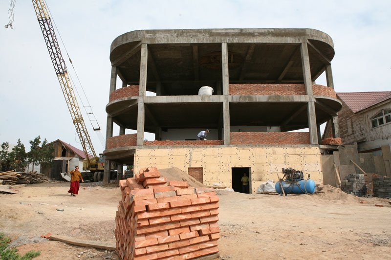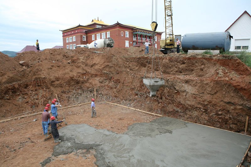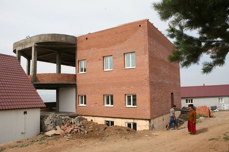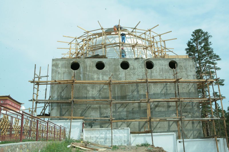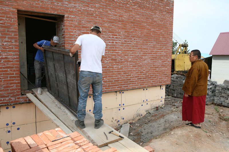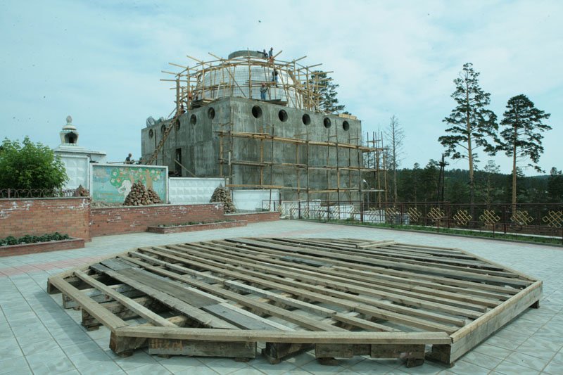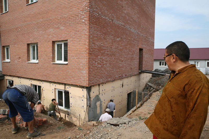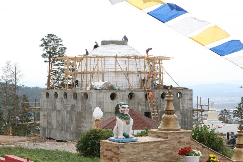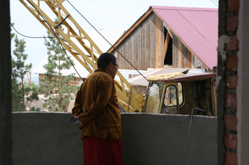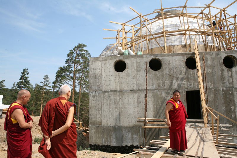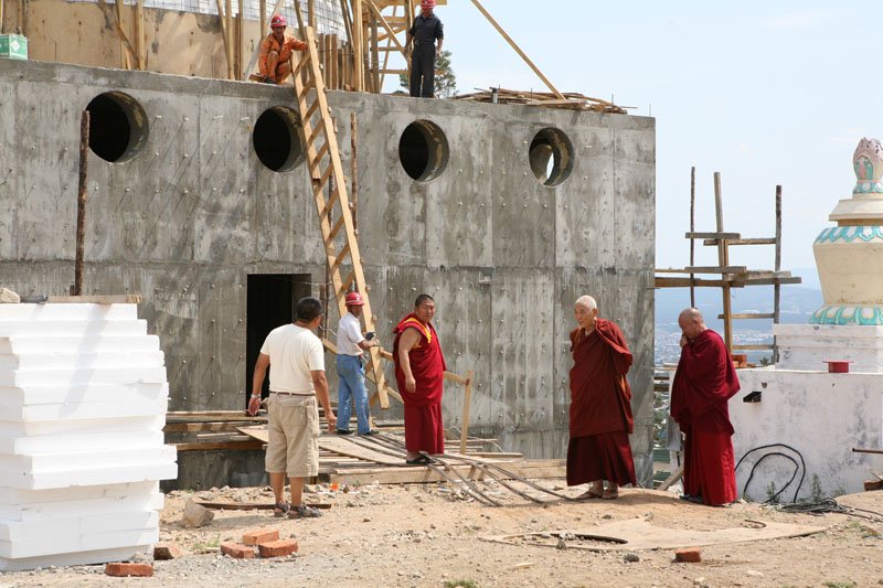 Бетонный каркас одной из ступ уже практически завершен, и она встречает входящих на территорию как величавый тихоокеанский дхармический лайнер. Место под вторую ступу было освящено в самый первый день ежегодных летних учений, и буквально на глазах она как будто бы начала расти из-под земли. Китайские рабочие очень мастеровиты и дружелюбны на вид. Некоторые из них неплохо говорят по-русски. Большую террасу столовой нужно успеть застеклить до зимы, а в ступы провести отопление ― ведь это не обычные ступы, а ступы с внутренним двухуровневым помещением, где будет расположена галерея 1080-ти божеств долгой жизни. Кстати, пока еще есть возможность разместить в этих ступах свое персональное божество. Для этого необходимо внести пожертвование в 10.000 рублей и одно из божеств долгой жизни с этого момента будет числиться в особых списках лично за вами. Прекрасная возможность для накопления заслуг и помощи монастырю.