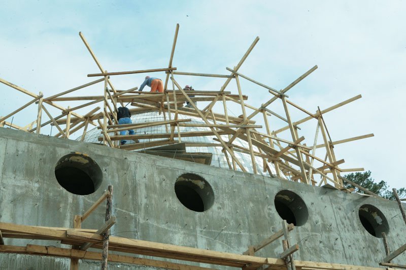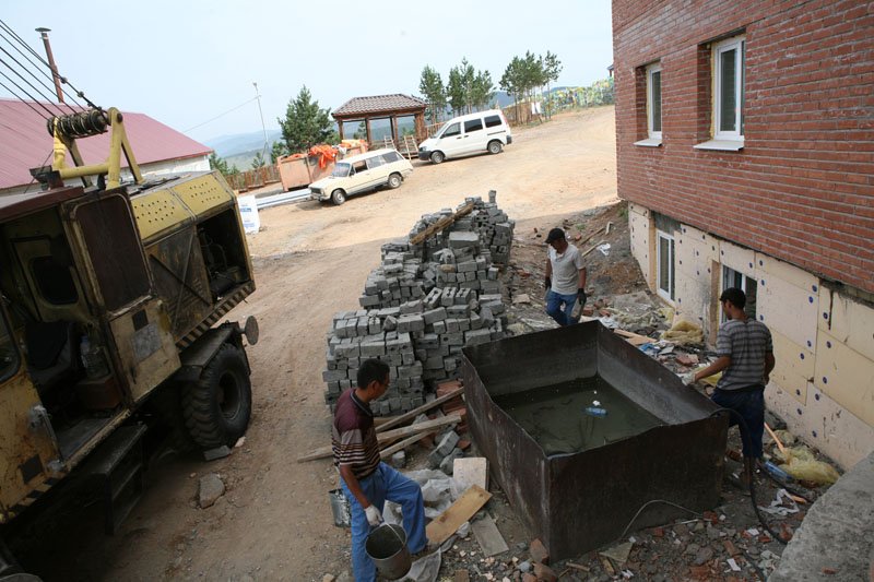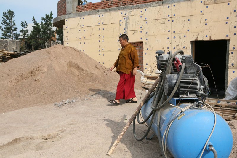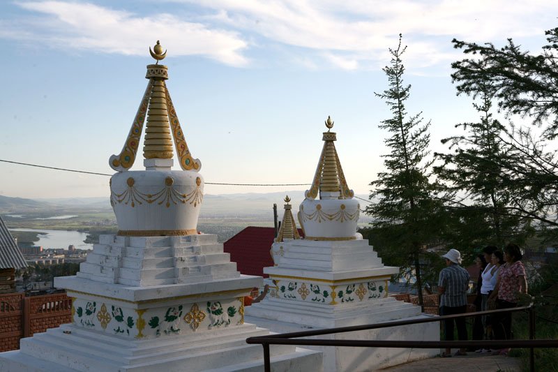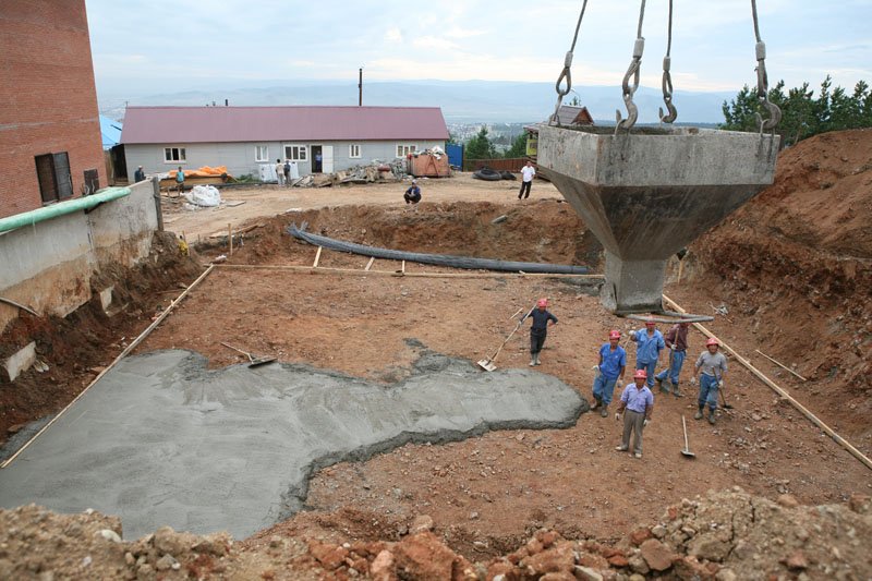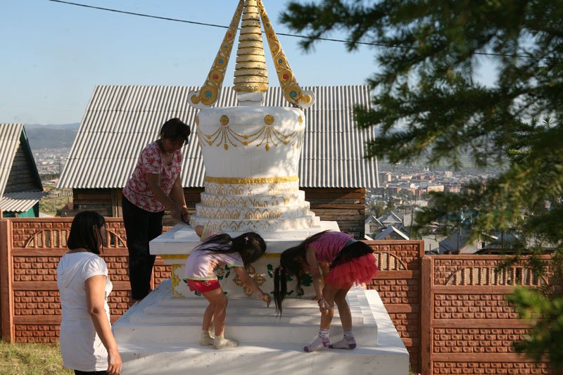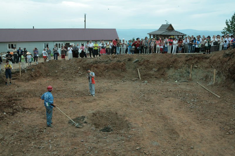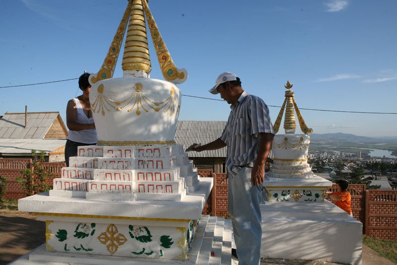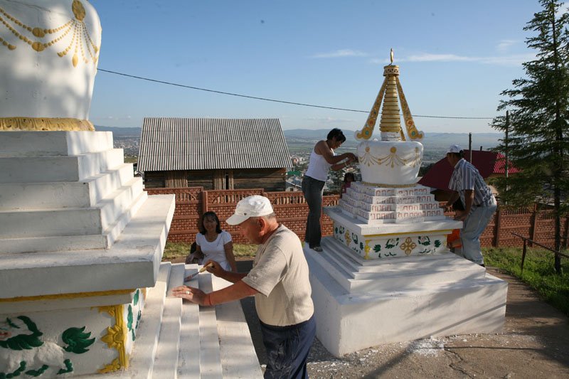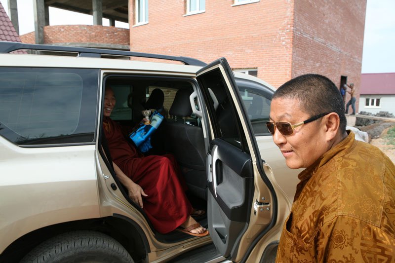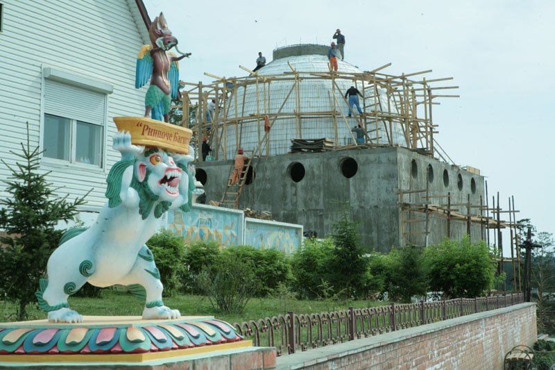 Бетонный каркас одной из ступ уже практически завершен, и она встречает входящих на территорию как величавый тихоокеанский дхармический лайнер. Место под вторую ступу было освящено в самый первый день ежегодных летних учений, и буквально на глазах она как будто бы начала расти из-под земли. Китайские рабочие очень мастеровиты и дружелюбны на вид. Некоторые из них неплохо говорят по-русски. Большую террасу столовой нужно успеть застеклить до зимы, а в ступы провести отопление ― ведь это не обычные ступы, а ступы с внутренним двухуровневым помещением, где будет расположена галерея 1080-ти божеств долгой жизни. Кстати, пока еще есть возможность разместить в этих ступах свое персональное божество. Для этого необходимо внести пожертвование в 10.000 рублей и одно из божеств долгой жизни с этого момента будет числиться в особых списках лично за вами. Прекрасная возможность для накопления заслуг и помощи монастырю.