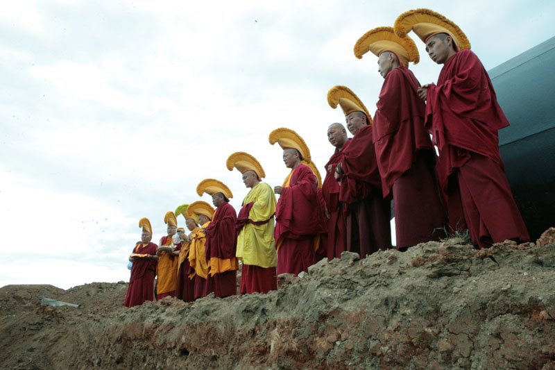 И хотя рабочие денно и нощно трудятся без выходных, а подъемные краны, экскаваторы и мощные самосвалы, перевозящие грунт, постоянно снуют туда-сюда, это как ни странно нисколько не мешает глубокому созерцательному настрою, духом которого пронизана вся мандала монастыря. Тяжеловесная техника здесь, на вершине горы, каким-то удивительным образом становится легкой для восприятия и движется почти бесшумно и незаметно. До холодов осталось не так уж и много времени, нужно постараться сделать как можно больше.