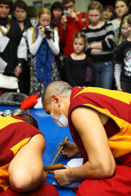 Построение песочной мандалы Авалокитешвары в главном храме (хуруле) «Золотая обитель Будды Шакьямуни» в Элисте, Калмыкия