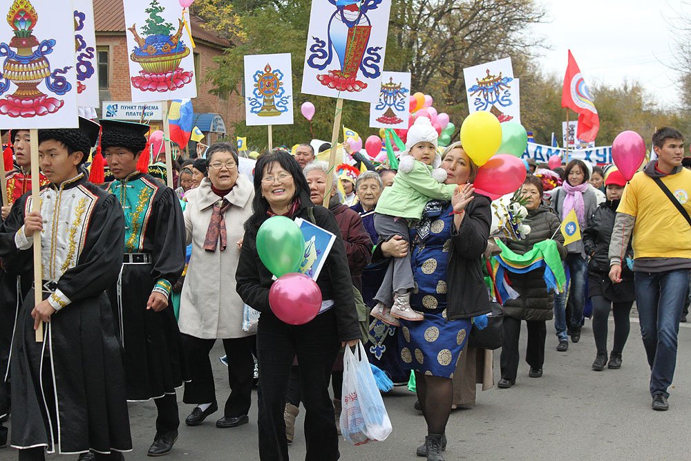 А затем впервые в Калмыкии состоялся духовный парад с участием представителей буддийских общин и центров, верующих, молодежных организаций. Под звуки буддийских музыкальных инструментов, с буддийскими символами, цветами, разноцветными шарами, флажками эта красочная процессия прошла до Национального театра, где состоялся праздничный концерт.