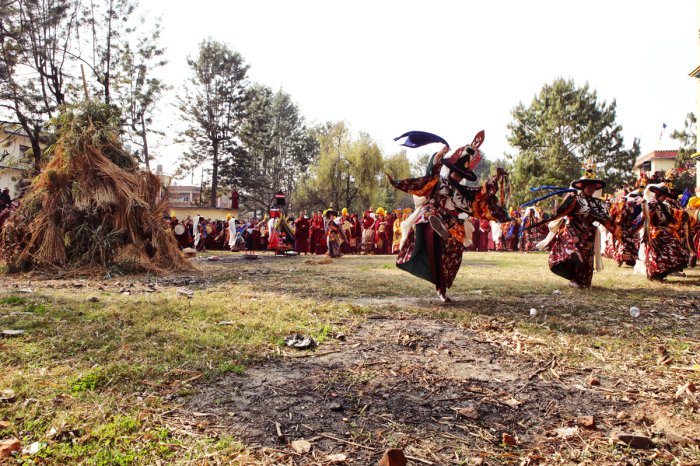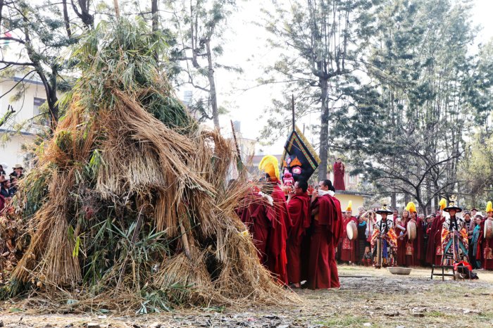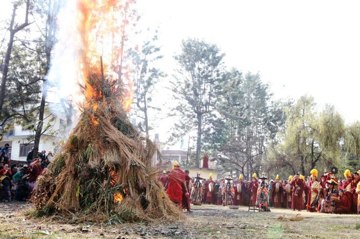 В это время ожидающие внутри зажигают охапку веток и хвороста и открывают дверь. Возвратившиеся быстро входят внутрь и перепрыгивают через потрескивающие в пламени колючие ветки. Остальные осыпают их цампой с одной стороны, а с другой обливают водой, производя ритуальное очищение и предотвращая попытку духов проскользнуть обратно в дом. Дверь или врата быстро захлопываются. Все члены семьи вновь усаживаются за столом по старшинству и продолжают трапезу. Девушки поют хвалебные песни тем, кто вытащил хорошие предзнаменования на будущий год, и подносят им чашу «прославляющего» чанга, а тем, кто вытащил дурные предзнаменования, подносят чашу «штрафного» чанга. Каждый из этих неудачников обязан спеть песню, сплясать или рассказать историю. Если же кто-то не в силах самостоятельно выполнить такое подношение, он должен прокукарекать, похрюкать, помычать и т.д., получив при этом очередную штрафную чашу чанга.