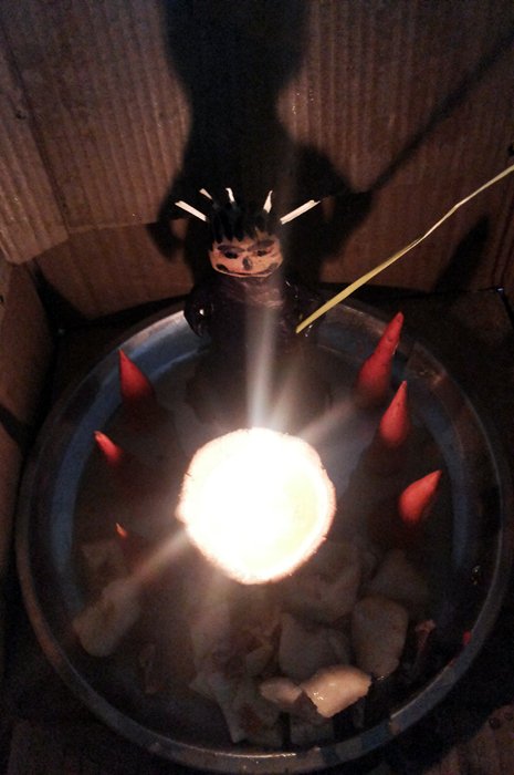Затем производят обряд изгнания духов и демонов из дома. Двое младших членов семьи мужского пола зажигают факелы из сухих веток ежевики или соломы и обходят все комнаты и помещения, размахивая ими над головой и произнося устрашающим голосом: «Идите прочь! Идите прочь, злые духи и демоны!» Затем одна из девушек выносит тарелку с фигуркой лю, забрызганной остатками пищи и грязи, из дома. Один из юношей с факелом в руке сопровождает ее, имитируя своим поведением изгнание и преследование духов. Вместе они несут лю к ближайшему перекрестку дорог. Остальные громко хлопают в ладоши, топают ногами и улюлюкают, отпугивая духов от дома. В некоторых семьях в это время взрывают петарды и стреляют из ружей. Затем входные двери или ворота плотно закрываются.
