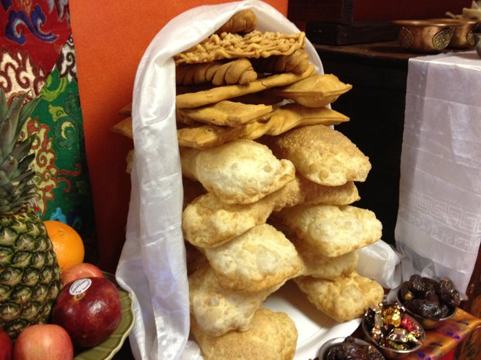 Конечно же, во время сооружения новогоднего алтаря не все из вышеперечисленных предметов и блюд могут оказаться под рукой. Возможно, полноценные новогодние алтари сооружаются только в крупных монастырях, и ни одна тибетская семья не может позволить себе подготовить все необходимые компоненты. Нужно помнить, что, во-первых, строгих правил организации новогодних алтарей нет, а во-вторых, самый главный аспект любых подношений – это практика даяния и щедрости, а не дороговизна предметов подношения или впечатляющая красота алтаря. Чистым в нравственном отношении считается подношение, выполненное без желания получить что-либо в ответ.