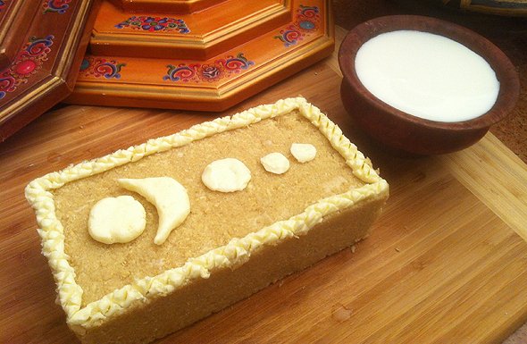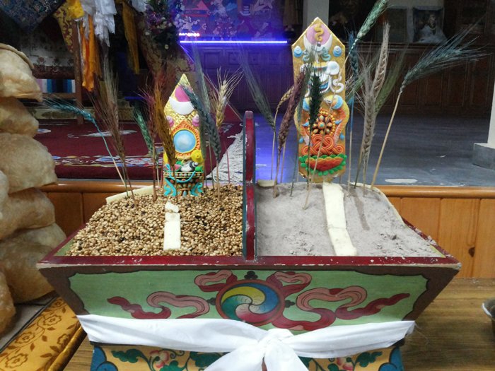 Самые важные предметы на алтаре – дросо-чемар и дэрка. Способ их приготовления, история и детальное описание приведены в третьей части статьи, здесь же мы опять ограничимся лишь общим обзором. Дросо-чемар (тиб. gro so phye mar) – это традиционное тибетское подношение, оно съедобно, но не является самостоятельным блюдом. Два его самых важных компонента – это дросо (тиб. gro so), обжаренные зерна пшеницы, и чемар (тиб. phye mar), цампа замешанная с маслом и сахаром. Их, не смешивая, помещают в два отдела специального деревянного ящичка, разделенного деревянной дощечкой, называемого бо (тиб. ‘bo). Сверху на обжаренную пшеницу кладут три или пять небольших кристаллов каменной соли, а на цампу – три или пять кусочков масла. В центр каждого отдела бо втыкают по одному цэдро (тиб. rtse sgro), дощечке, напоминающей птичье перо, с масляной скульптурой. Вокруг цедро втыкают длинные окрашенные в разные цвета колосья пшеницы или ячменя и стебли «новогоднего цветка» (тиб. lo gsar me tog), название которого, к сожалению, перевести не удалось.