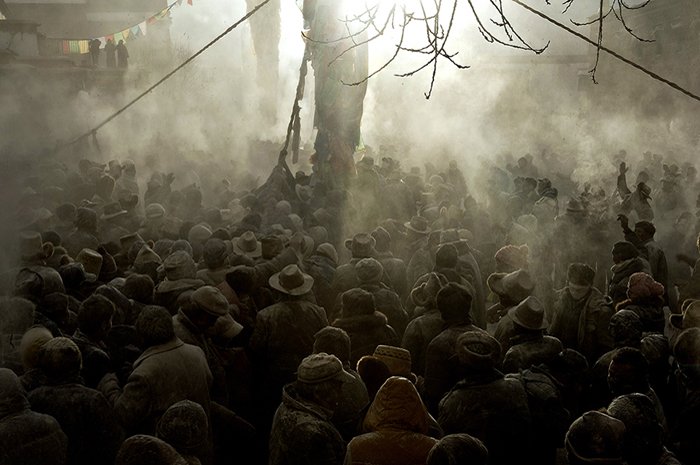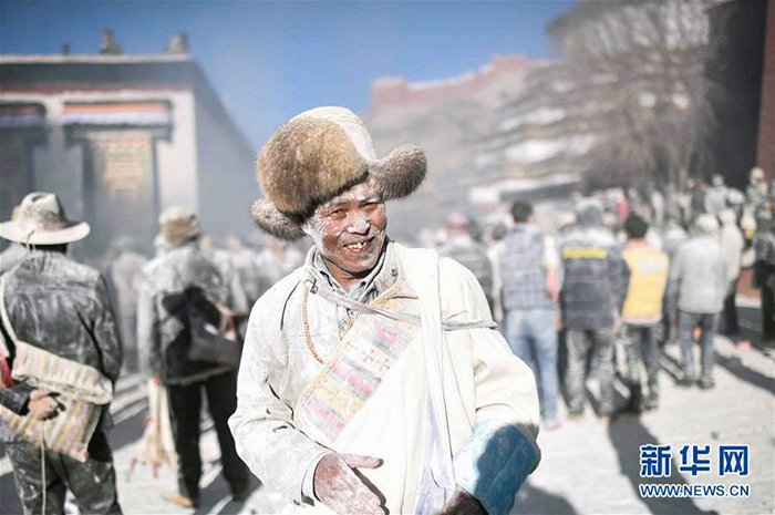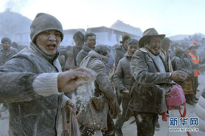 Ранним утром пятнадцатого числа все верующие города собираются на площади перед главным монастырем, которая с других сторон окружена еще семью монастырями, чтобы совместными усилиями поднять новогодние флаги. Перед тем как поднять дарчен, собравшиеся со всех сторон привязывают к его верхней части под основным полотнищем свои флаги лунг-та, на которые предварительно наносят молитвы и пожелания. Затем дарчен поднимают при помощи канатов и крепят в основании. После чего производится упомянутое выше массовое подношение цампы лхагьял-тенпа, основная цель которого – призыв к местным божествам и хранителям защитить новый урожай и поголовье домашнего скота от различных дурных воздействий и неблагоприятных условий. Однако такое огромное скопление людей приводит к тому, что цампа, сыплющаяся с неба как снег, покрывает площадь и находящихся на ней людей густым слоем белой пудры, и действо превращается в потешный ритуал «очищения цампой» (тиб. bsang rtsam), когда все в едином ликующем порыве осыпают друг друга горстями цампы. Насколько можно судить по фотографиям с места событий, зрелище это не только очень красочное, но и поднимающее настроение, а участие в нем, по всей видимости, само по себе укрепляет эмоциональное здоровье на очень длительный срок!