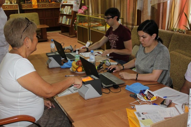В работе специалисты использовали два ноутбука и два специальных сканера (в прошлом году было четыре сканера. Каждый клиент сдавал свои отпечатки в три приема: сначала клал на сканер четыре пальца (кроме большого) левой руки, затем прижимал четыре пальца правой руки и в завершение процедуры плотно прикладывал одновременно два больших пальца.