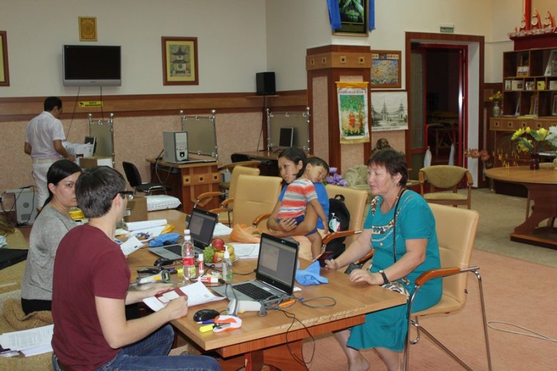 Год назад, в сентябре 2016-го, эта группа уже проводила аналогичную работу здесь (также в течение трех дней). Так что с менеджером по корпоративным продажам визового сервиса Каримом Мешерги и менеджером по работе с Латвией Алексеем Кохно мы уже были знакомы, а вот вместо третьего члена группы Аурики Паладинской теперь была старший специалист Кристина Карпинская. Эти специалисты вели свою работу – мобильную биометрию - в читальном зале храмовой библиотеки. Клиенты проходили к ним по очереди, предварительно пройдя проверку необходимых документов в коридоре, где за столами вели прием материалов и давали консультации координатор паломнической поездки Лариса Алляева и ее помощники из числа сотрудников хурула и волонтеров. Чтобы не было столпотворения в коридоре клиенты-заявители дожидались своей очереди в конференц-зале, где они могли отдыхать сидя, угощаясь чаем, кофе, сладостями.