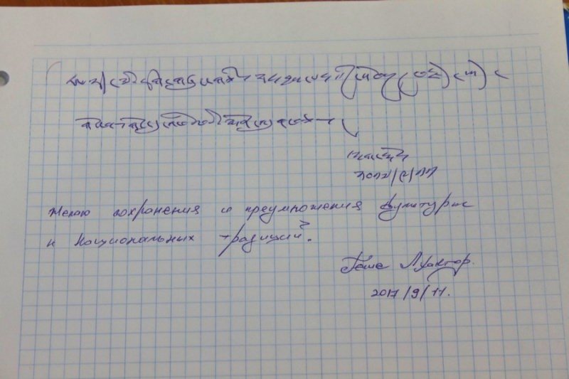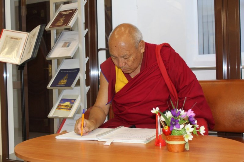 В ходе экскурсии геше Лхакдор фотографировал особенно заинтересовавшие его экспонаты, а завершив обход представленной экспозиции в просторном помещении Музея традиционной культуры, он по просьбе заведующей Светланы Батыревой сделал запись в книге отзывов. Написав свои пожелания на тибетском языке, высокий гость попросил переводчика Чагдыра Санджиева сделать под его записью письменный перевод. Текст высокого гостя республики гласит: «Желаю сохранения и преумножения культуры и национальных традиций. Геше Лхакдор. 2017.9.11».