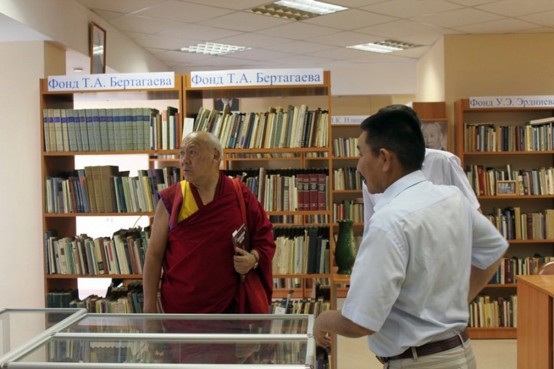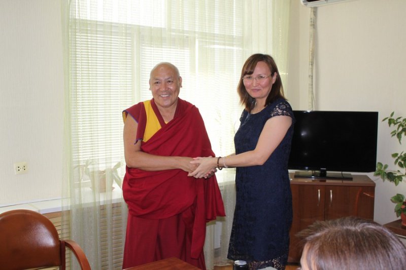 После экскурсии досточтимого геше Лхакдора проводили в кабинет директора Калмыцкого научного центра, где его ждали приглашенные сотрудники учреждения. Поприветствовав высокого гостя от имени коллектива, Виктория Куканова представила ему присутствовавших сотрудников, занимающихся исследованиями в области языка, письменности, народной культуры, буддийской философии. Многие из них помнят геше Лхакдора по его неоднократным ярким выступлениям на международной конференции «Буддизм в диалоге культур Востока и Запада» в Элисте в 2015 году. Тогда на пленарном заседании геше Лхакдор представил доклад на тему «Современное состояние буддизма. Буддийский взгляд на систему образования». Затем в секции этого научного форума, называвшейся «Буддийские ценности и вопросы образования, воспитания, этики», он выступил с интересным докладом «Преподавание основ буддийской философии и логики на примере учебных заведений Индии». А участвуя в работе секции «Тибетологические и буддологические исследования: история и современность», геше Лхакдор зачитал доклад на тему «Классификация буддийских текстов. Вклад Библиотеки тибетских трудов и архивов в научную текстологию».