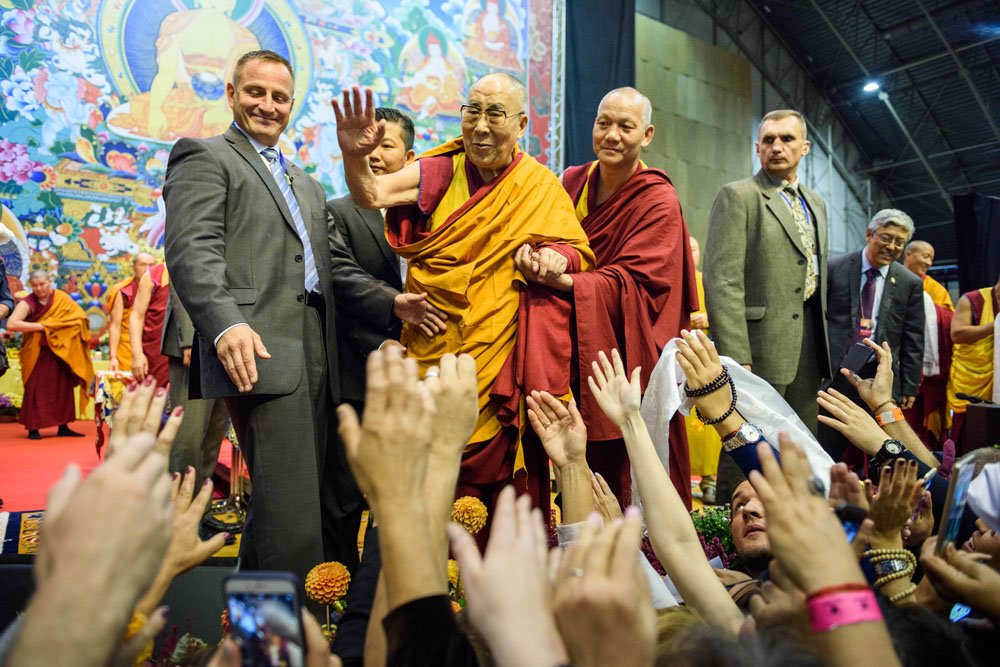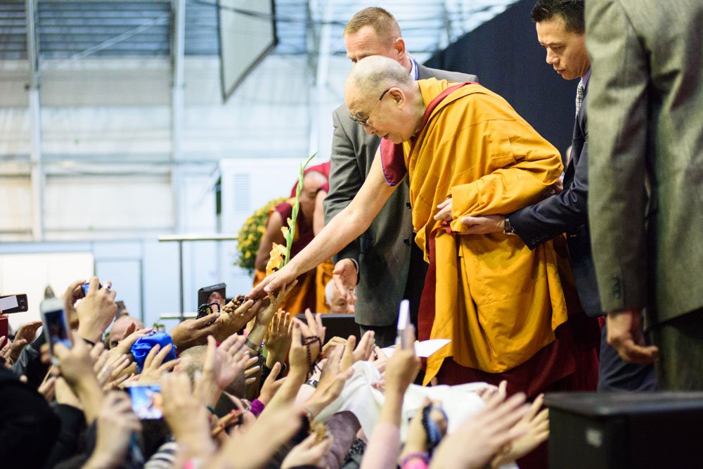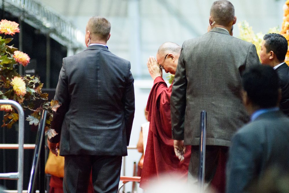 Далай-лама прощается. Неизменная доброжелательная улыбка, касание его руки к тянувшимся рукам из зала. Бесконечные вспышки камер.