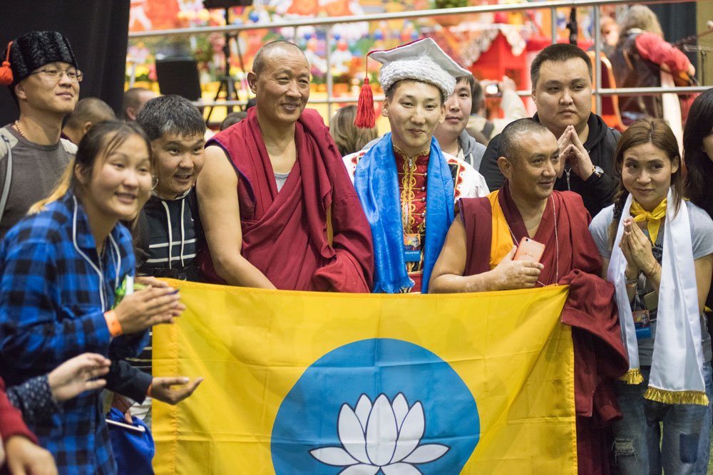 Утро. Совершается буддийский обряд ламами и членами общин – огненная пуджа – подношение божествам для устранения препятствий ради блага всех живых существ. Зал практически готов. Цветами, которые после завершения учений будут быстро разобраны всеми желающими, украшается сцена, где монахи занимаются местом расположения Далай-ламы и монахов, которые традиционно слушают учения рядом с Его Святейшеством, на сцене.