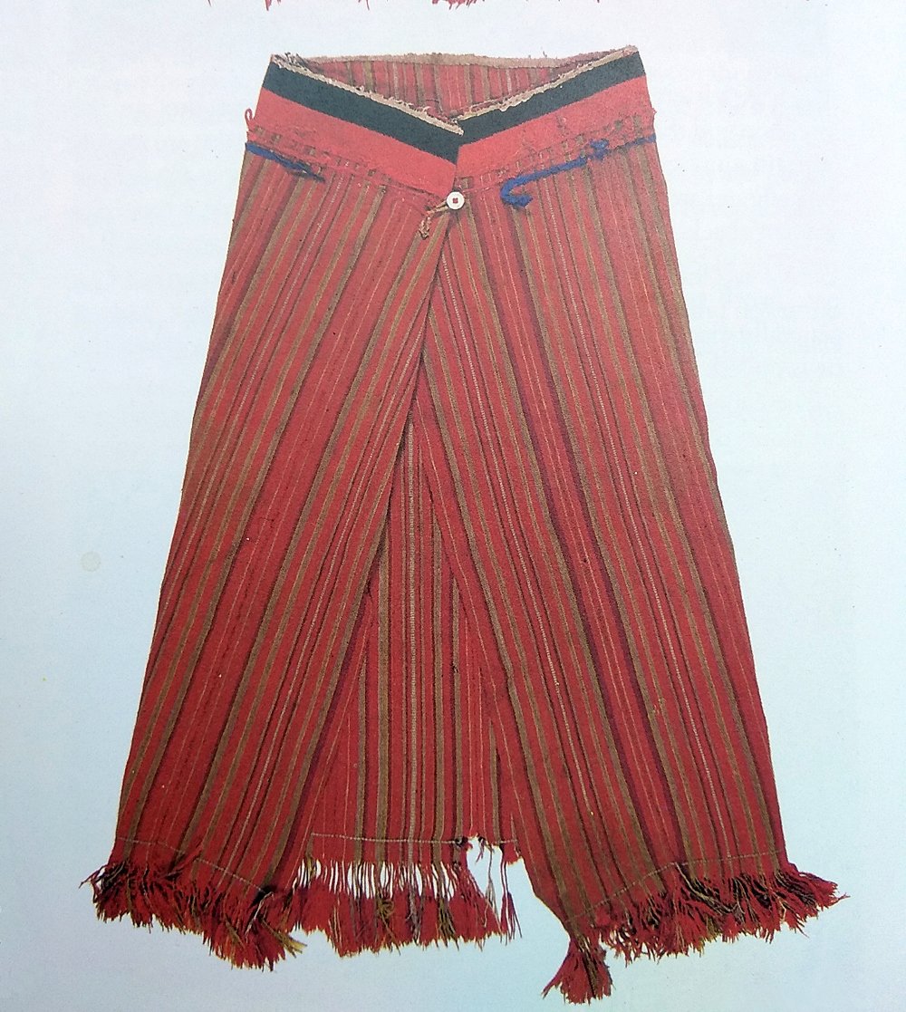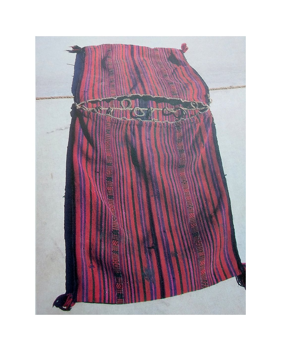 Начнем мы свой обзор с овечьих мешков луг-гел. Как бы странно это ни звучало, но в некоторых регионах Тибета (в основном на юго-западе, западе и северо-западе – в У-Цанге, Нга-ри и Джанг-танге), основу поголовья домашних животных кочевников составляет мелкий рогатый скот, поэтому овец, как и коз, иногда используют в качестве вьючных животных, а потому для них шьют специальные вьючные мешки. От прочих вьючных мешков они отличаются меньшим размером, а вот от обычных мешков еще и конструкцией. Несмотря на то что крепят их непосредственно на спину животных без вьючного седла, как и большинство тибетских вьючных мешков, они двойные, а точнее спаренные. Отдельный мешок в такой спарке называют нэ-до (тиб. sne do). Оба мешка имеют общую основу, к которой с одной стороны пришиты нагрудная и задняя шлейки (ремни или веревки), необходимые для удержания поклажи при движении животных вверх и вниз, а с другой стороны – небольшие петли для фиксации шлеек. Шьют такие мешки из двух параллельных полос ткани, сотканной на горизонтальном ткацком станке (ширина подобных станков позволяет ткать ткань шириной 25–32 см). При этом полосы сшивают таким образом, чтобы узор ткани зеркально отражался относительно шва. Завязки с мешками не используются – после загрузки их просто зашивают. В качестве основы ткани используется ячья или козья шерсть, возможна также их комбинация, причем используются только грубые остистые волокна (подобная ячья шерсть называется ци-па (тиб. rtsid pa)), а мягкий подшерсток – кашемир или ку-лу (тиб. khu lu) – не используется. Он не обладает требуемыми прочностными качествами, к тому же пользуется большим рыночным спросом, а посему почти полностью идет на продажу. Ткут мешки из нитей двух цветов – более светлого и более темного. Причем основным цветом может быть как один, так и другой, главное чтобы цвета контрастировали. Шерсть не красят, а используют ее натуральный окрас. Как и остальные мужские принадлежности, вьючные мешки ткут только мужчины. Ни для чего другого, кроме как перевозки грузов на овцах и козах, они не подходят. Используются в основном для транспортировки соли.