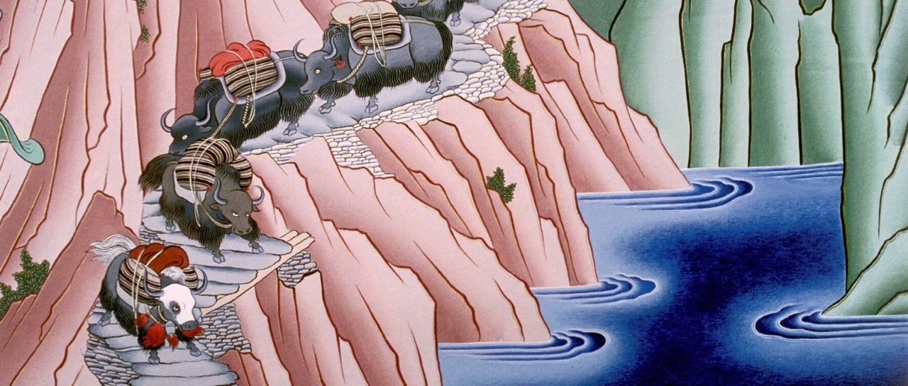 Сегодня мы познакомимся с одним из носителей подобного узора и очень важным предметом, используемым в хозяйственной деятельности всеми без исключения тибетскими кочевниками – вьючными мешками. Их значение трудно переоценить, ведь подобные мешки используют не только для транспортировки личных вещей во время сезонных кочевок, но и во время торговли молочными продуктами, зерновыми культурами, солью, шерстью и т.д. Добыча соли и ее транспортировка перекупщикам или потребителю, к примеру, составляет немалую часть дохода иных кочевников, ну а про торговлю продуктами собственного производства говорить и вовсе не приходится. О роли их в жизни тибетцев говорит хотя бы тот факт, что вместе с сюжетами, отображающими наиважнейшие события в жизни кочевников, вьючные мешки попадают на храмовые фрески.