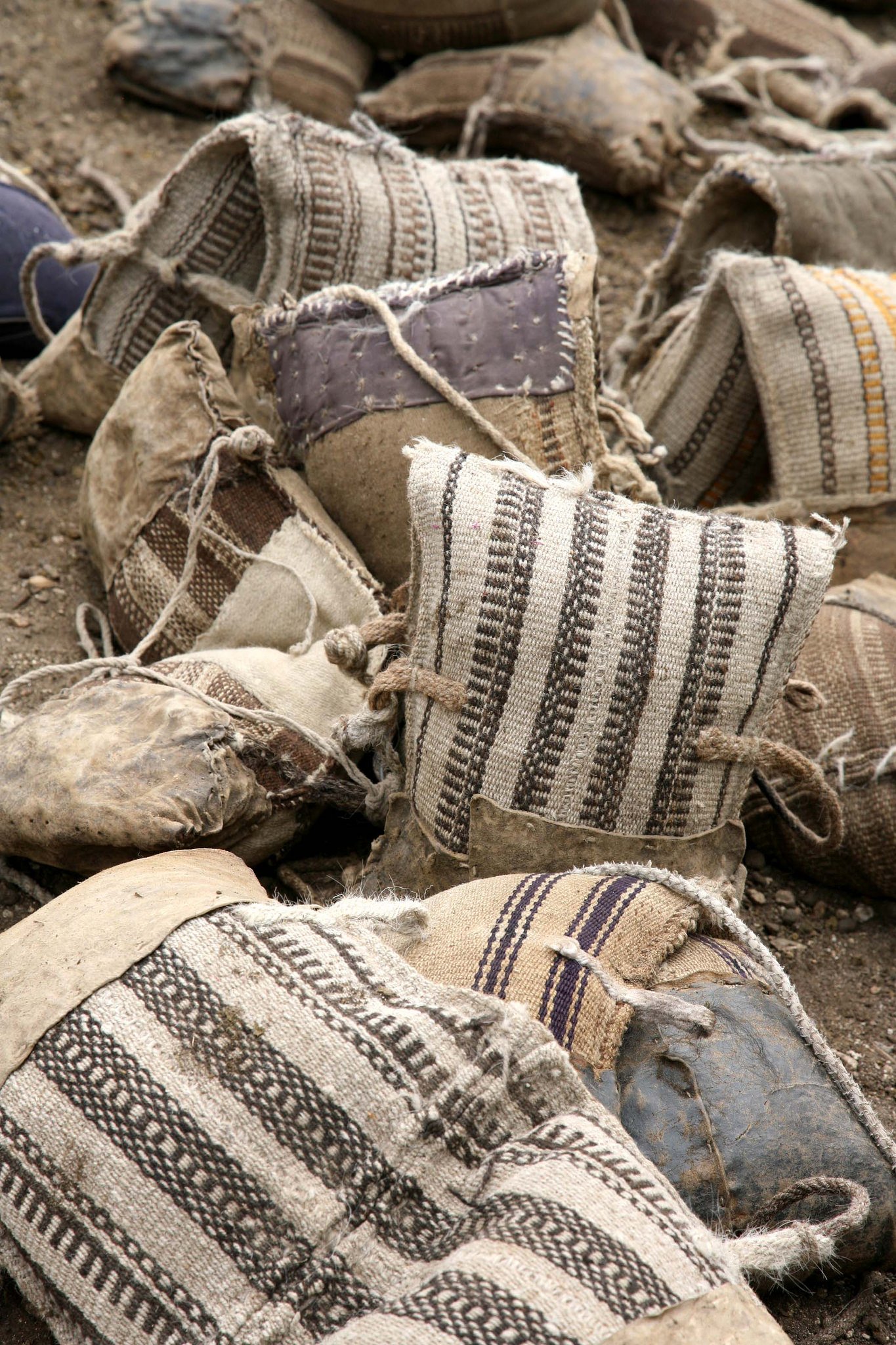 Наверно многие из тех, кто интересуется тибетской культурой или же по какой-то причине побывал в Тибете (или, например, в Ладаке), отметили для себя особую любовь тибетцев, а также жителей других гималайских регионов, к узорам в полоску. Такими узорами могут украшать ткань, используемую для пошива элементов праздничной или повседневной одежды, а также иных принадлежностей, используемых в быту: обуви, сумок, поясов, одеял, покрывал, половых ковриков, чепраков (подстилок под вьючные и скаковые седла), торб для лошадей (суконных мешков с овсом, которые крепят к мордам животных), уздечек, ошейников и т.д. В этот перечень можно включить и рассматриваемые нами сегодня вьючные мешки. Может показаться, что традиционную любовь тибетцев к подобным узорам, помимо тяги к прекрасному и желания украсить свою повседневную жизнь, вызывает простота и легкость их изготовления (более сложные узоры ткать вручную на примитивных ткацких станках, которые до сих пор используют тибетские кочевники, довольно трудно и долго). И это предположение отчасти верно, однако помимо легкости тканья, эти узоры обладают еще одним достоинством и важным практическим применением – они могут служить своеобразной меткой или, если хотите, подписью или даже печатью для обозначения личных принадлежностей с целью их последующей идентификации среди других подобных предметов.