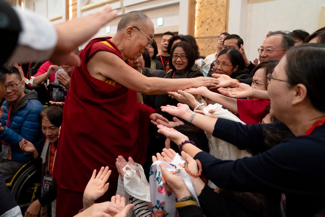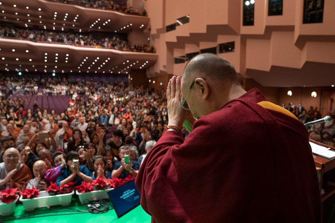 И снова Его Святейшество помахал рукой зрителям, затем замер на несколько мгновений со сложенными у груди руками, словно молился об их благополучии, и покинул сцену. Завтра в Токио Его Святейшество прочтет публичную лекцию для молодежи на тему «Мы едины – мы одна семья».