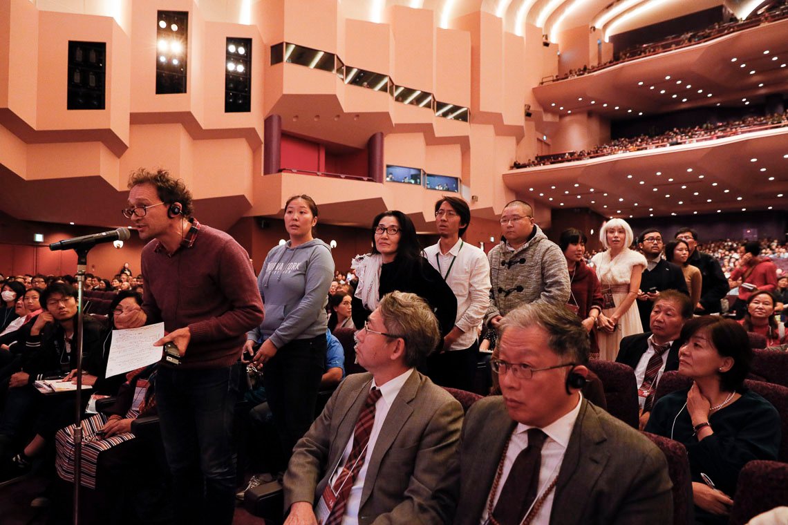 Йокогама, Япония, 16 ноября 2018 года – Сегодня утром, когда Его Святейшество Далай-лама присоединился к экспертам на сцене Национального зала собраний, Юко Ямагучи поприветствовала участников обсуждения и пять тысяч зрителей и произнесла несколько вступительных слов. Затем она пригласила к микрофону Его Святейшество.