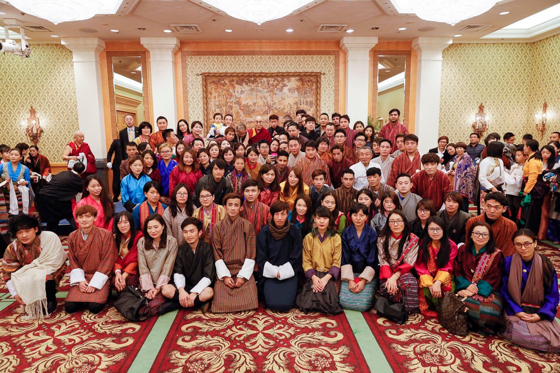 Его Святейшество Далай-лама позирует для совместного фото по завершении встречи с представителями тибетского и бутанского сообществ. Фото: Тензин Чойджор.