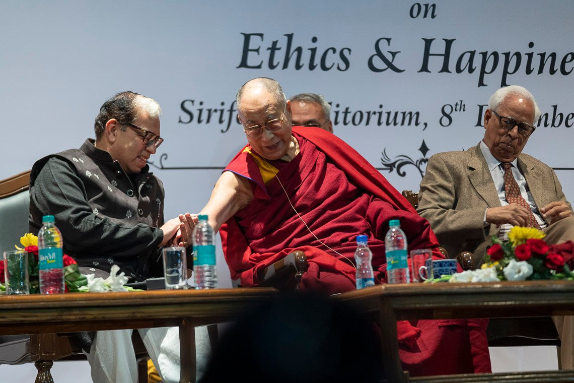 Викрам Чандра сказал, что для всех присутствующих было большим счастьем послушать Его Святейшество. С. Сатьямурти, главный исполнительный директор Антикоррупционной академии, произнес несколько заключительных слов. Он заметил, что по мнению Его Святейшества, наше счастье зависит от счастья других, и не следует обманываться внешней видимостью.