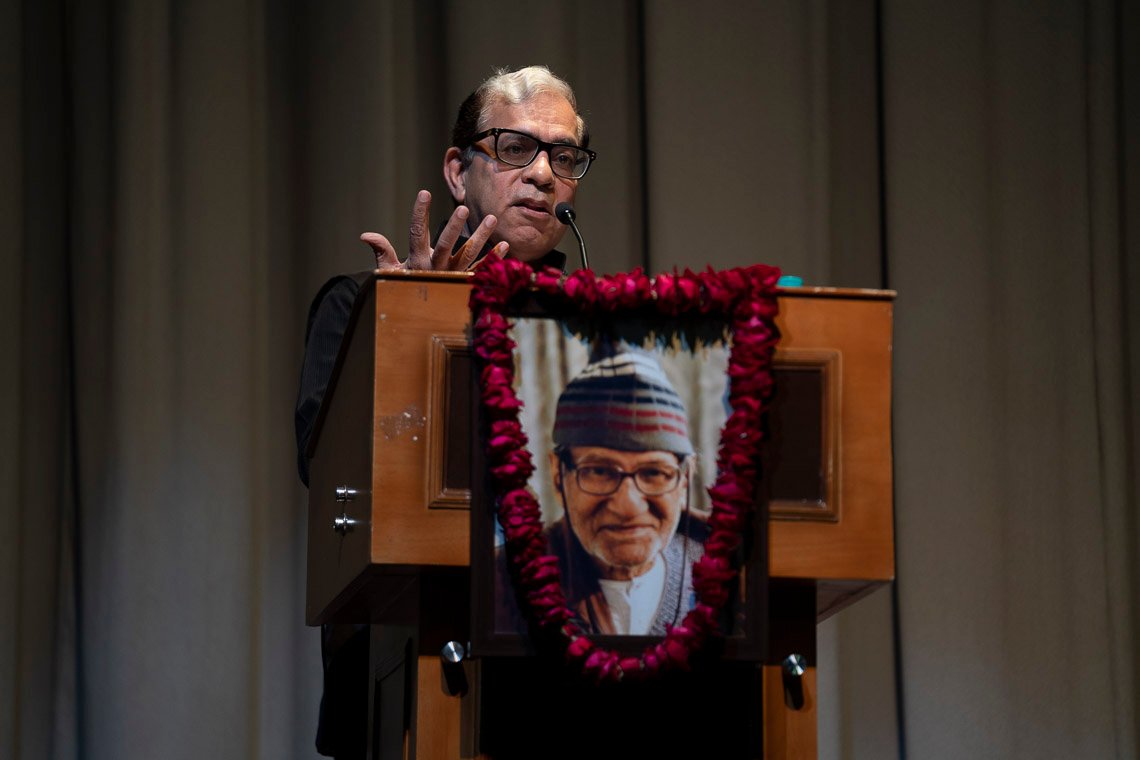 Судья Верховного суда А.К. Сикри выступает с обращением перед началом первой лекции Его Святейшества Далай-ламы в память о Юврадже Кришане. Фото: Лобсанг Церинг.