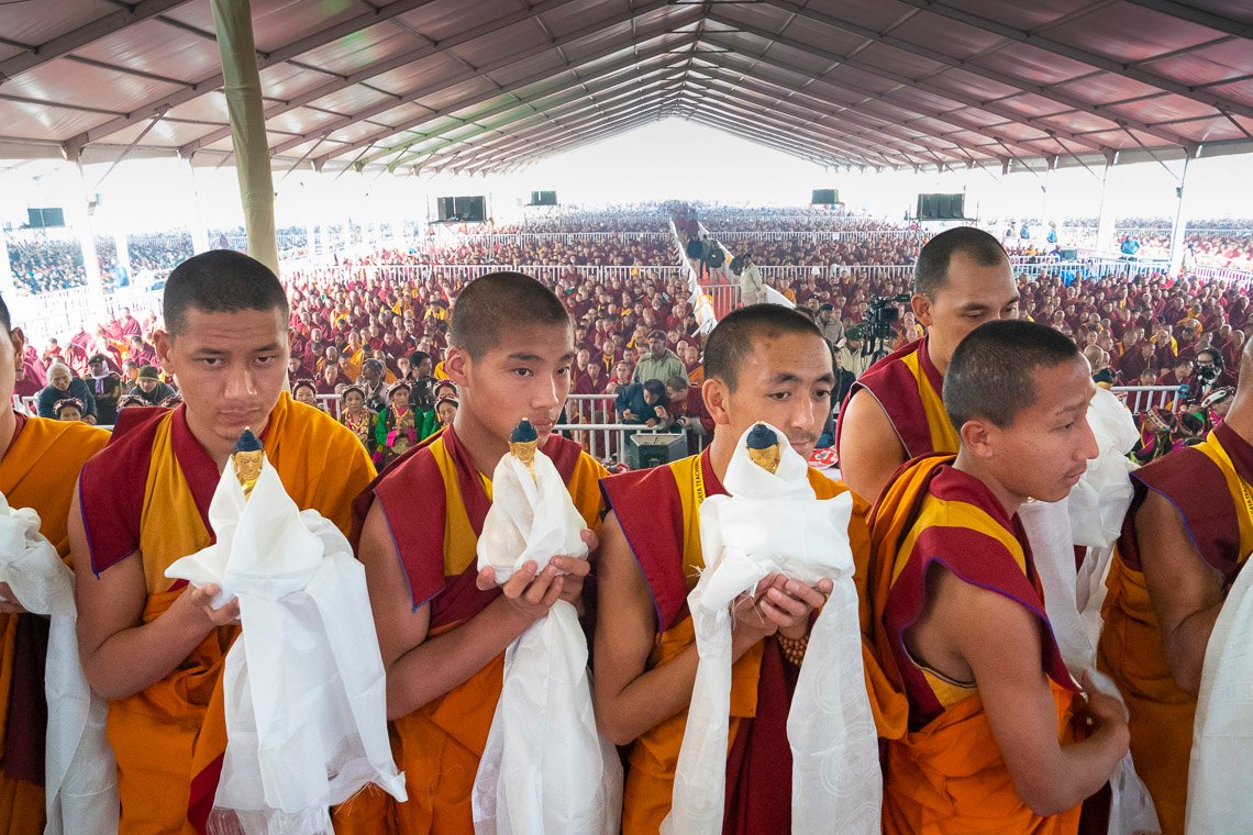 Монахи монастыря Намгьял делают подношения Его Святейшеству Далай-ламе во время молебна о долголетии на площадке Калачакры в Бодхгае (Индия, штат Бихар). 31 декабря 2018 г. Фото: Лобсанг Церинг