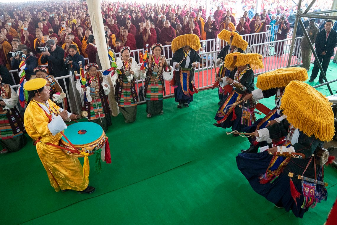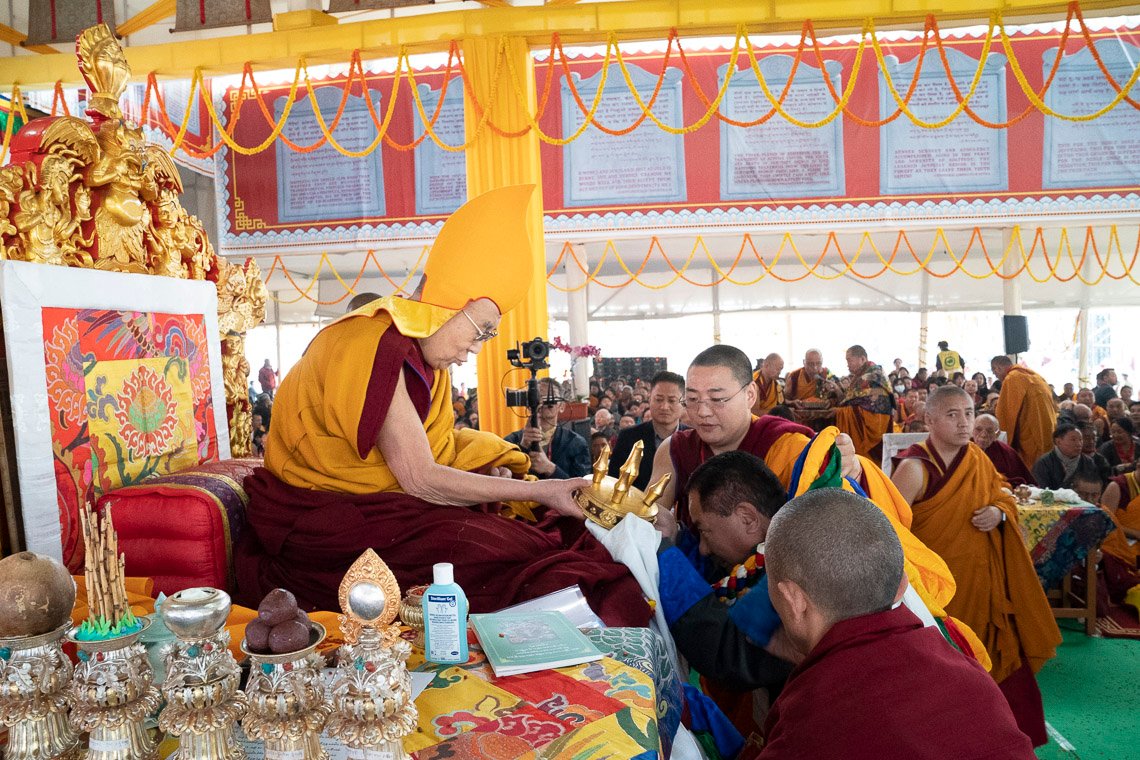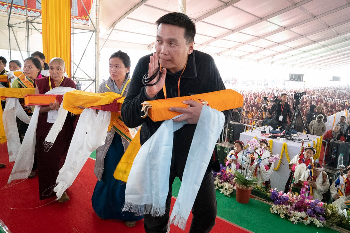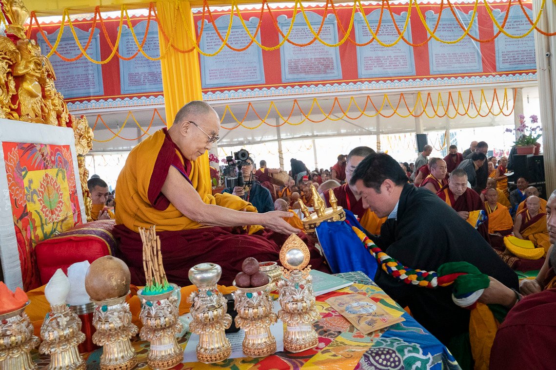 Ганден Три Ринпоче, настоятель монастыря Намгьял и сикьонг каждый поднесли по мандале и по три символа пробуждения, а затем Сакья Тризин, Пема Джунгне, спикер тибетского парламента в эмиграции, Нгаванг Рабгьял и другие сотрудники ЦТА, несколько пожилых монахов монастыря Намгьял и Сопа Ринпоче совершили подношение Дхармачакры.