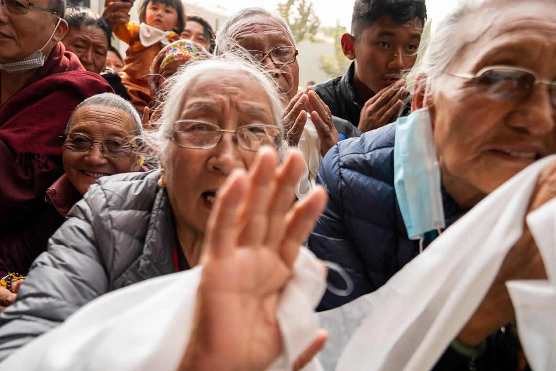 Его Святейшество Далай-лама машет рукой толпе, покидая сцену по окончании молебна о долголетии на площадке Калачакры в Бодхгае (Индия, штат Бихар). 31 декабря 2018 г. Фото: Лобсанг Церинг