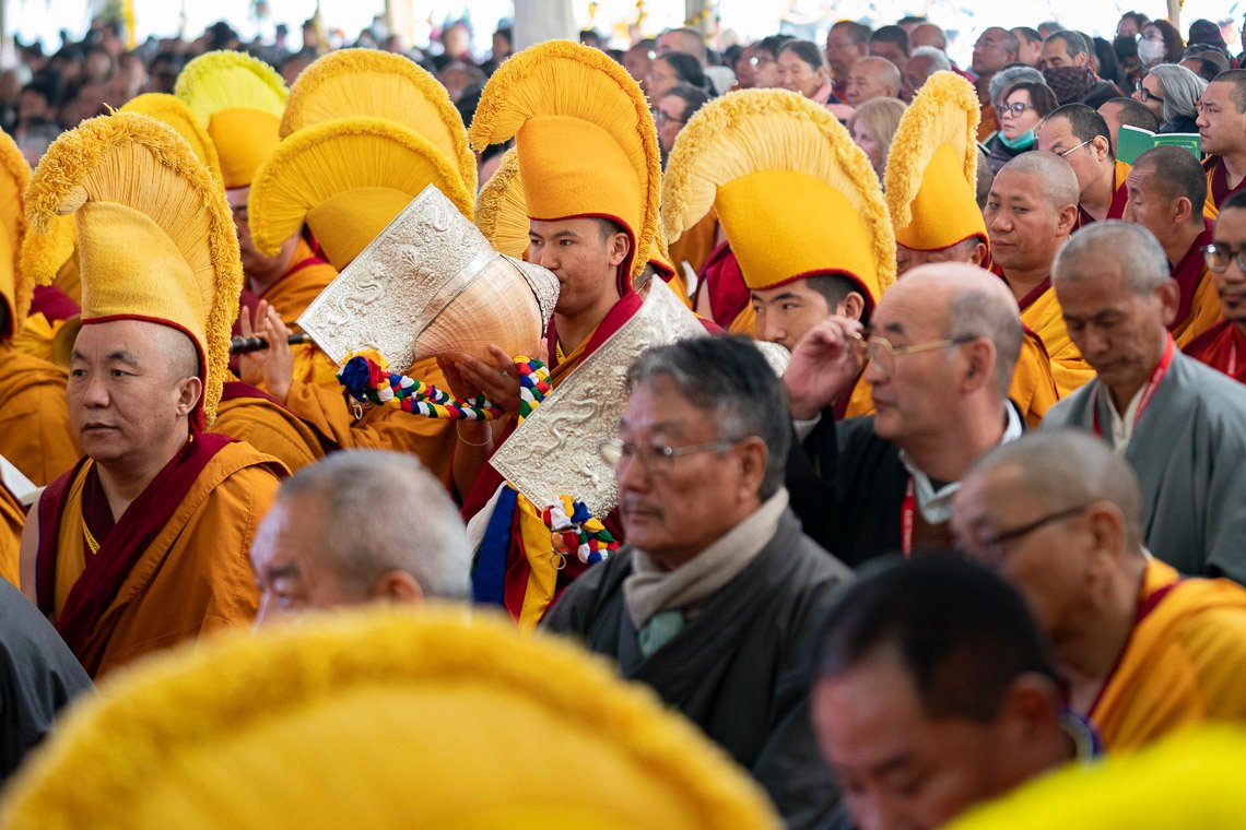 Монахи монастыря Намгьял, играющие на традиционных музыкальных инструментах, возвещают прибытие Его Святейшества Далай-ламы на площадку Калачакры в Бодхгае (Индия, штат Бихар). 31 декабря 2018г. Фото: Лобсанг Намгьял