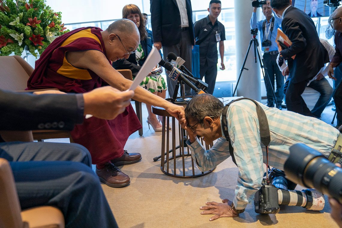Его Святейшество Далай-лама отвечает на вопросы в ходе пресс-конференции, приуроченной к запуску школьной программы социального, эмоционального и этического обучения (СЭЭО). Фото: Тензин Чойджор.