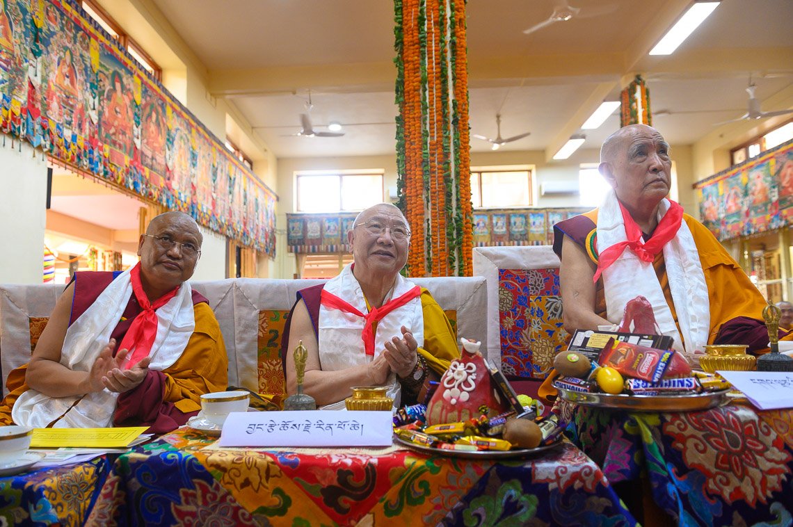 Справа от трона Его Святейшества, за Ганденом Трисуром Ризонгом Ринпоче, сидели настоятели монастырей Сера, Ганден, Дрепунг, Таши Лунпо, Гьюдмед и Гьюто, а слева от трона расположились бывшие и нынешние калоны.