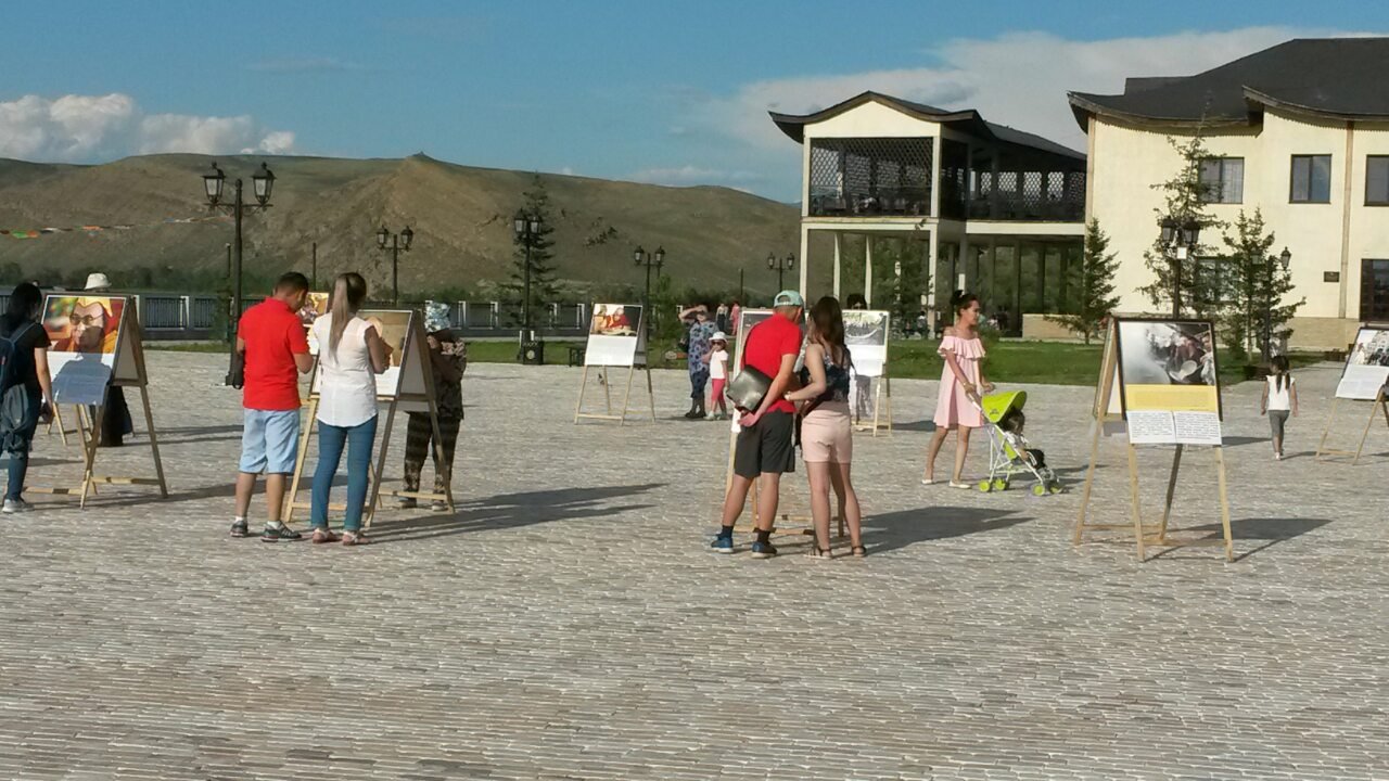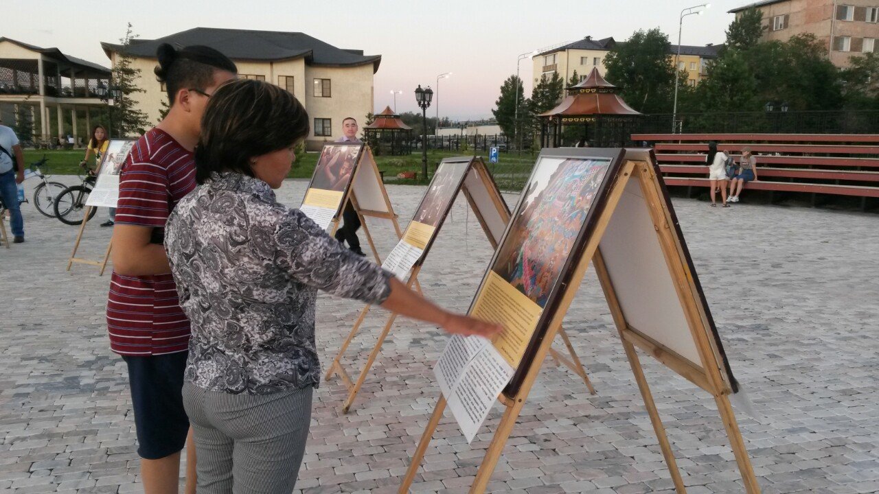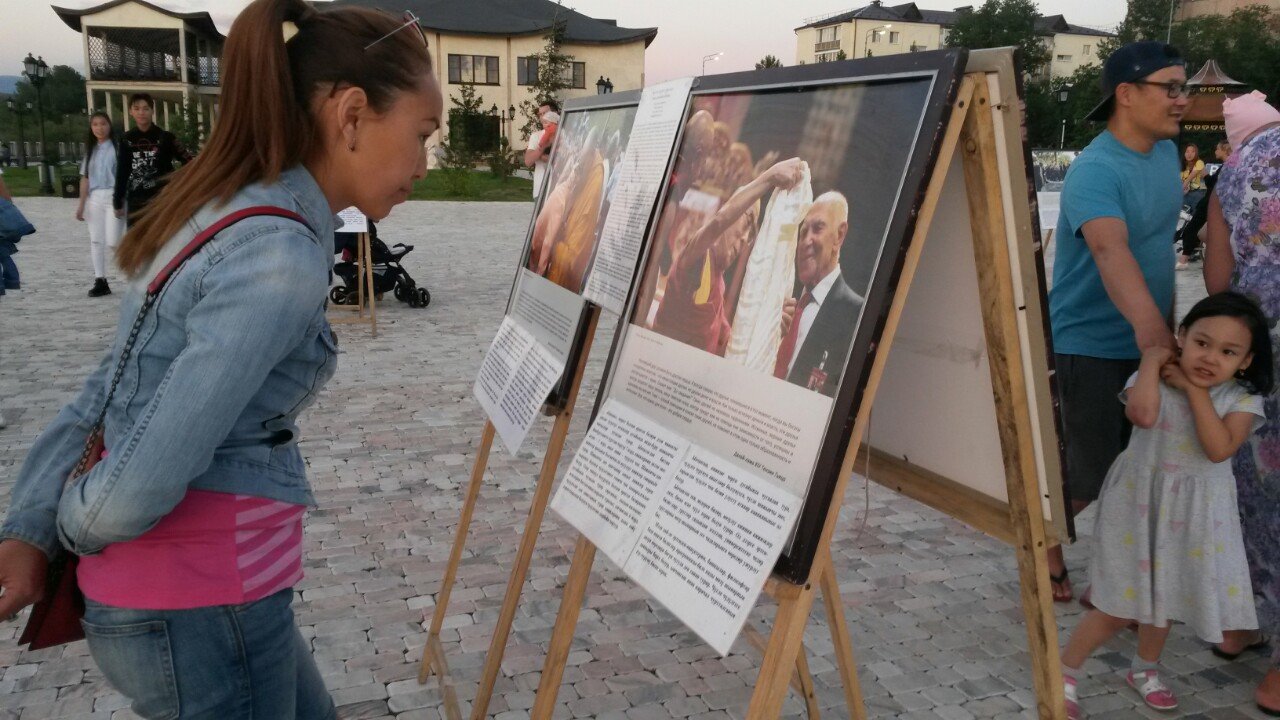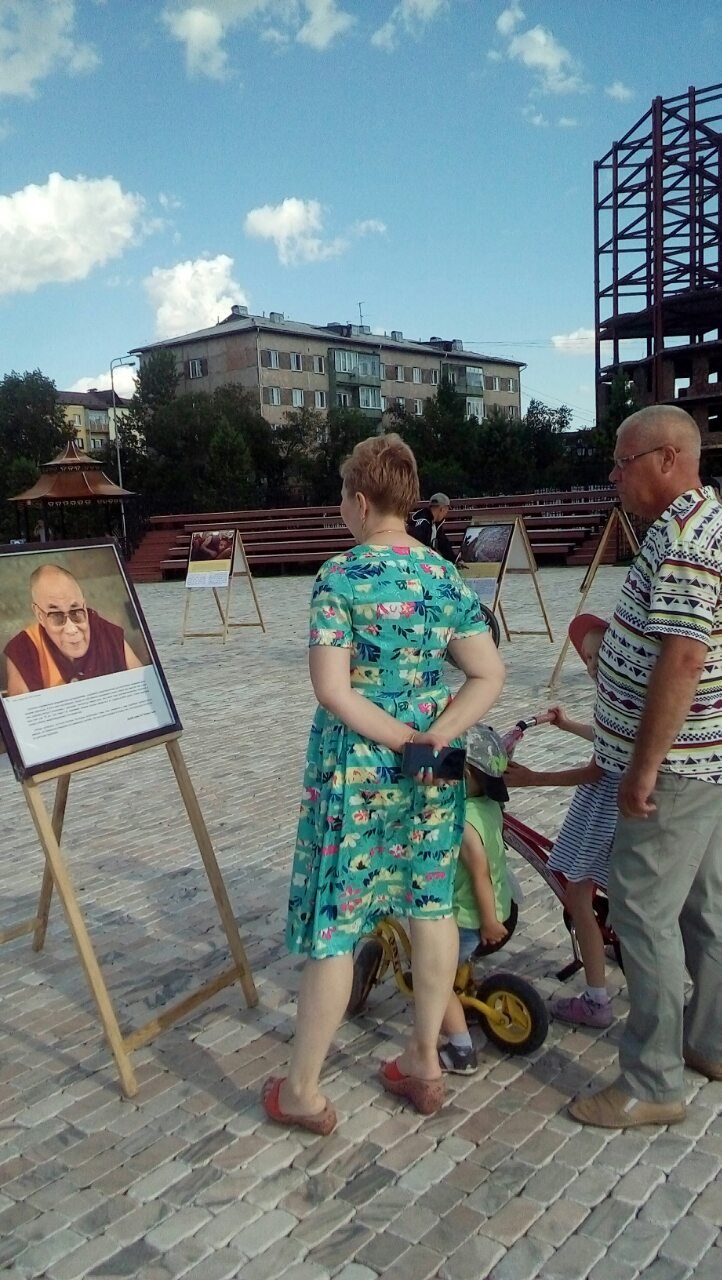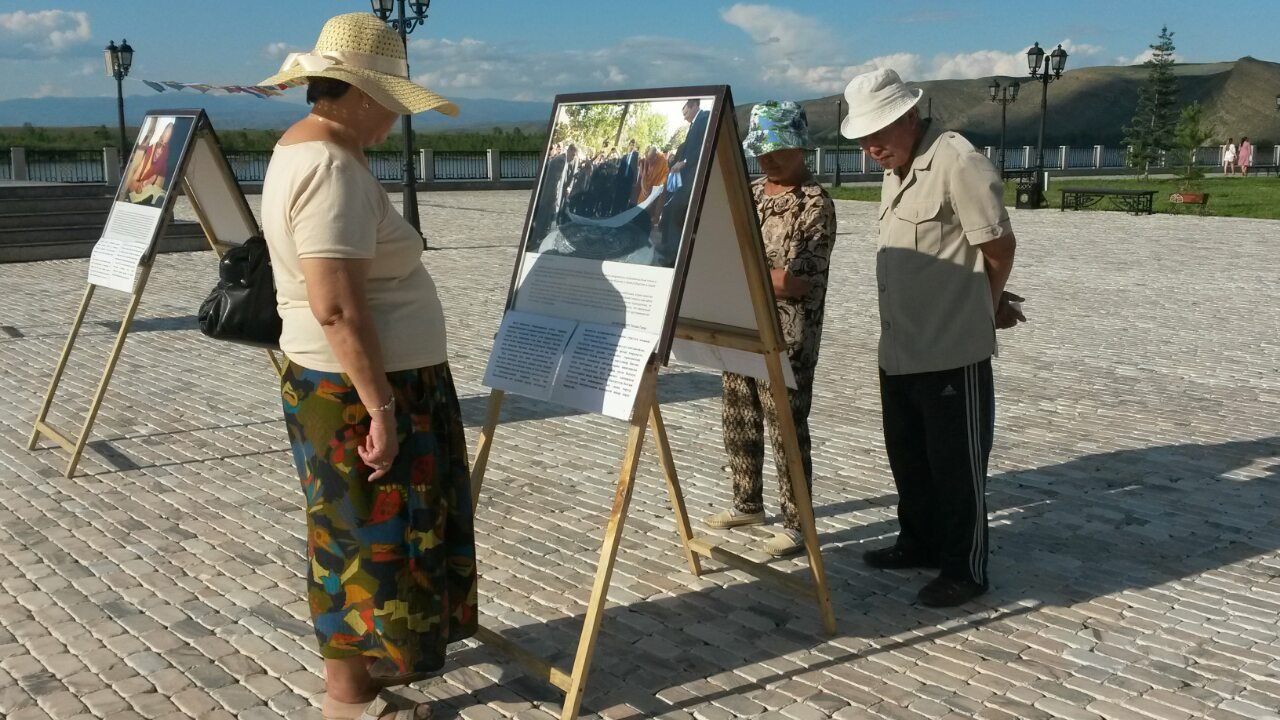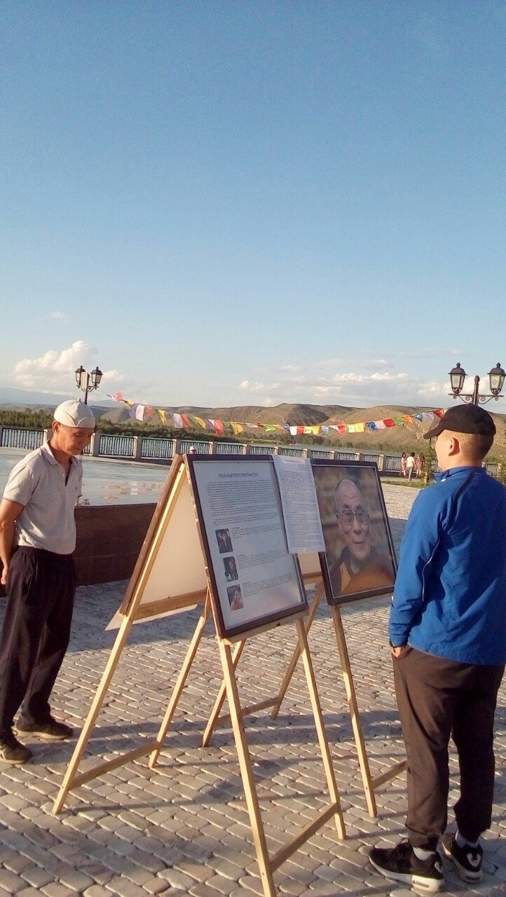 В особенном для тувинцев месте – на площадке амфитеатра знаменитого скульптурного комплекса «Центр Азии» в Кызыле – также царила праздничная атмосфера. На набережной Енисея открылась выставка красочных фотографий Его Святейшества. Каждое изображение ласкало взор живой улыбкой Учителя или несло его послание в виде цитат и советов для повседневной жизни. Слова Его Святейшества были переведены на тувинский язык, и посетители отметили, что на родном языке цитаты звучат для них более проникновенно.